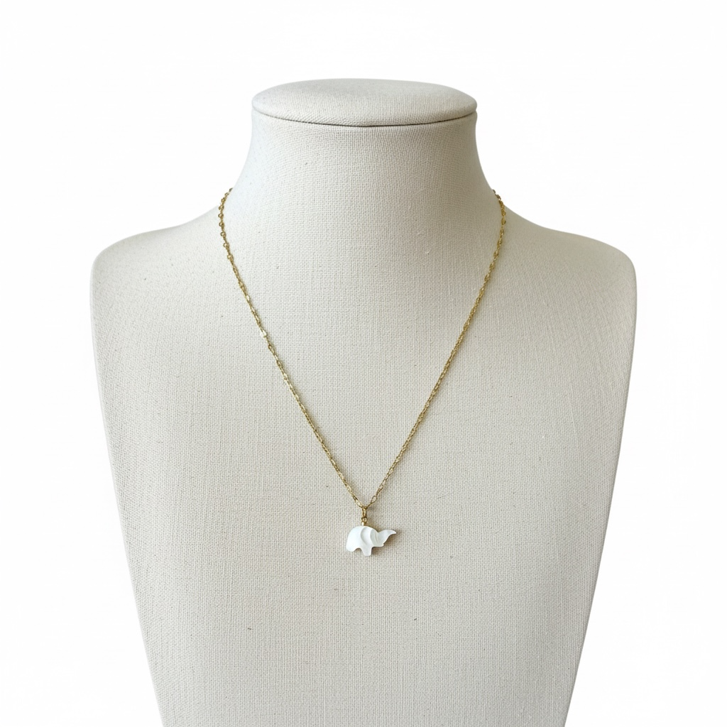 Embrace elegance with this meticulously crafted 18k gold-plated necklace. Featuring a dainty elephant pendant made with a lustrous pearly stone, this piece symbolises strength, wisdom, and good fortune. The creamy pearl tones contrast beautifully against the warm, polished gold, making it a sophisticated addition to your everyday attire or a heartfelt gift for someone special.