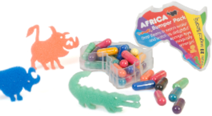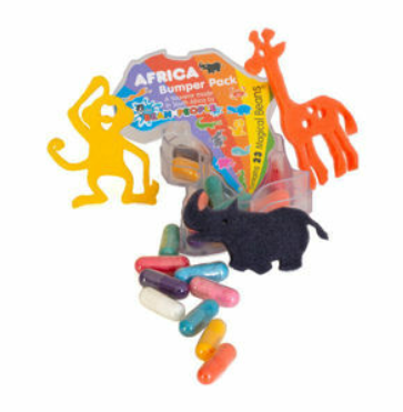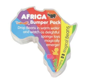 Africa Bumper Packs were created through demand from the public, asking for a product that contained lots of Beans. We chose the African theme, which also makes the item an ideal present for tourists visiting South Africa to take home with them and local South Africans to send abroad. Most of the 23 Beans in this pack are themed around African animals, sea creatures and creepy crawlies. All in a durable, cute Africa shaped container!