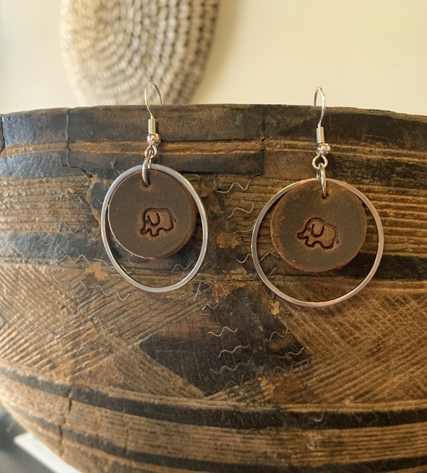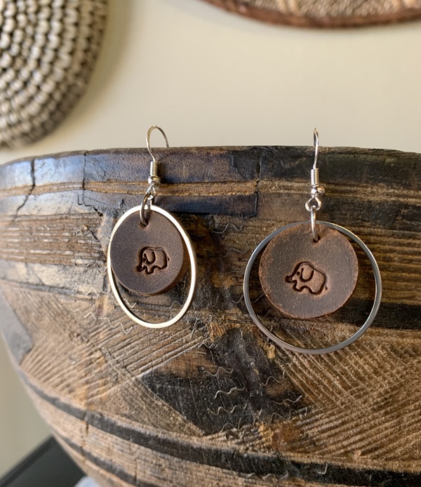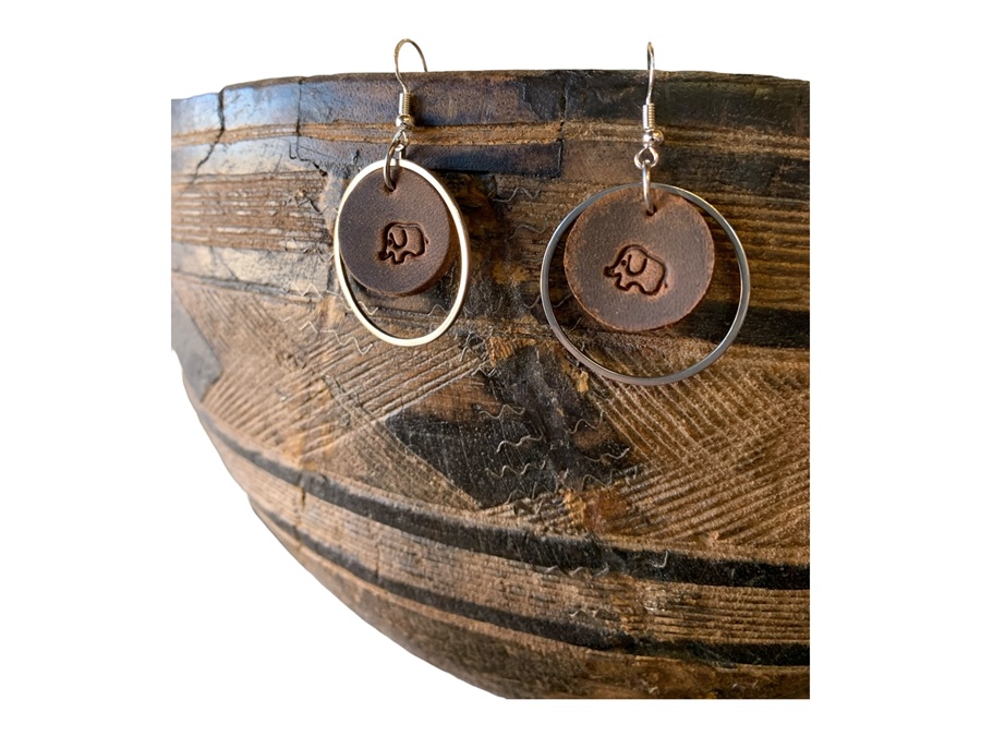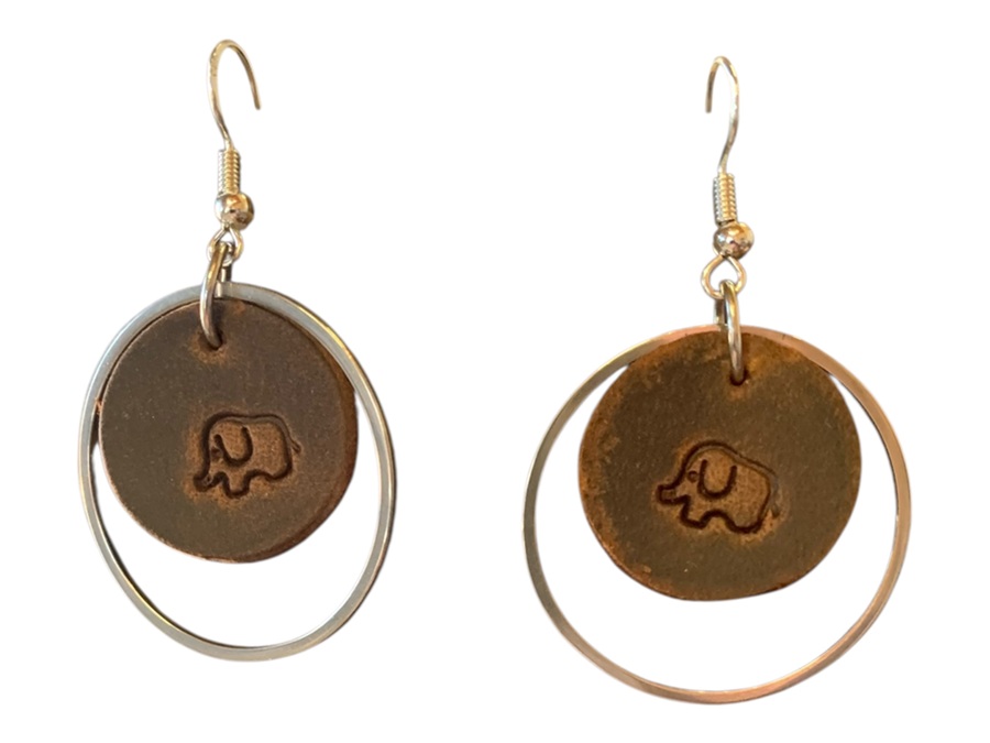 Exquisite genuine leather earrings adorned with stainless steel hoop and featuring a delicate elephant outline on the leather dangle.