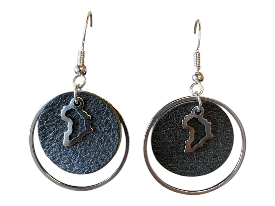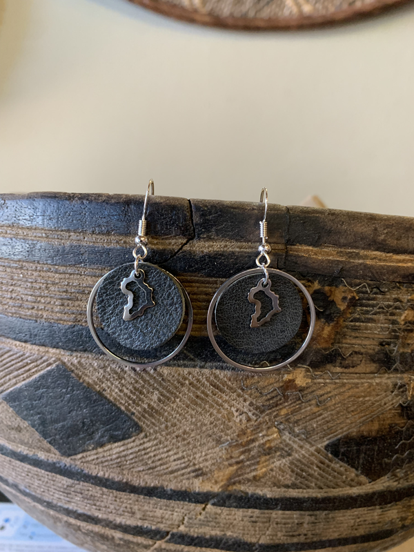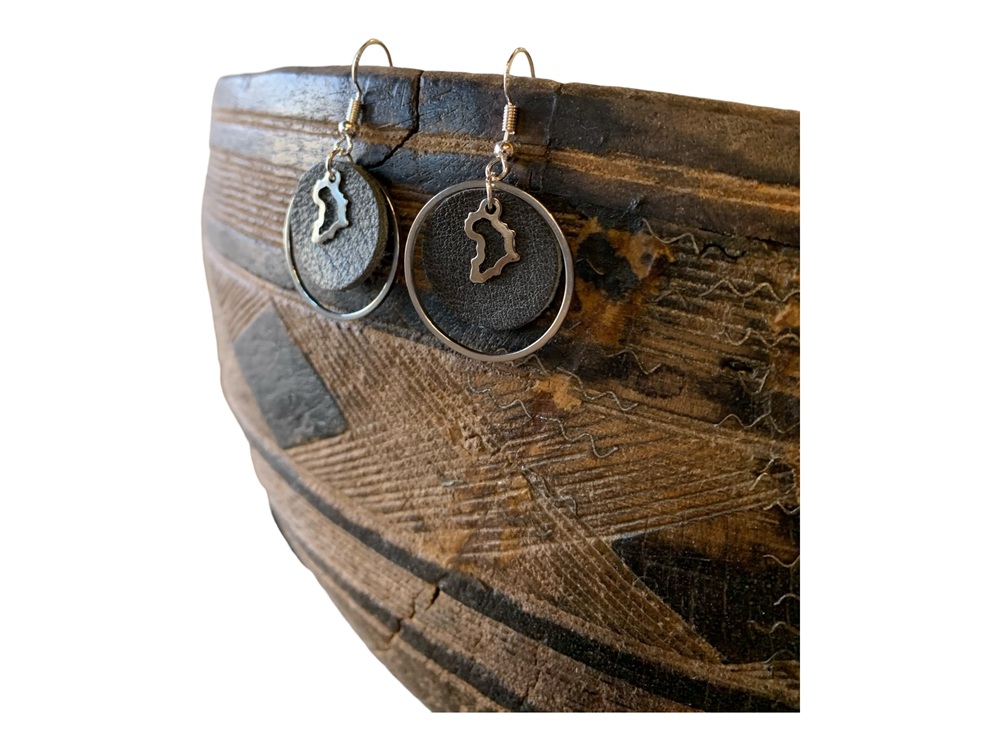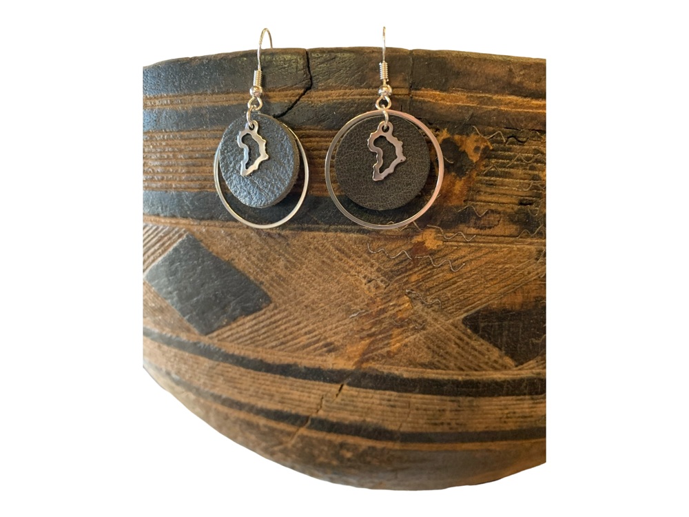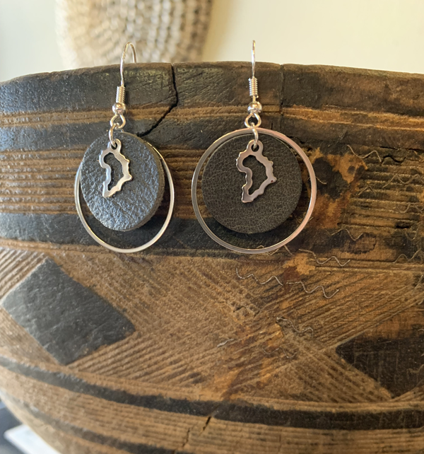 Exquisite genuine leather earrings adorned with stainless steel hoop and featuring a delicate Africa outline on the leather dangle.