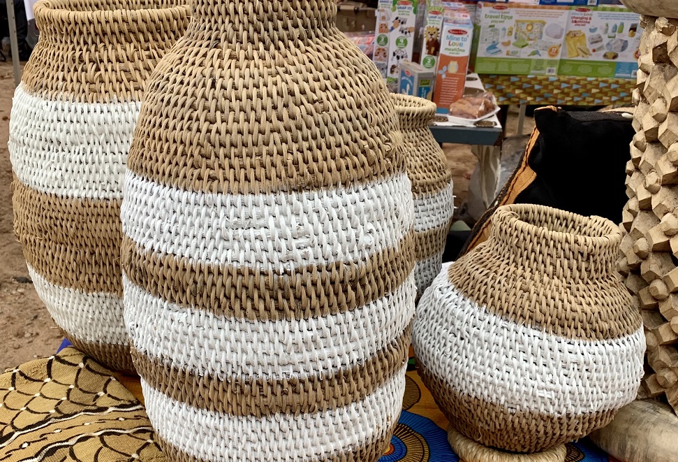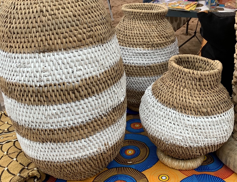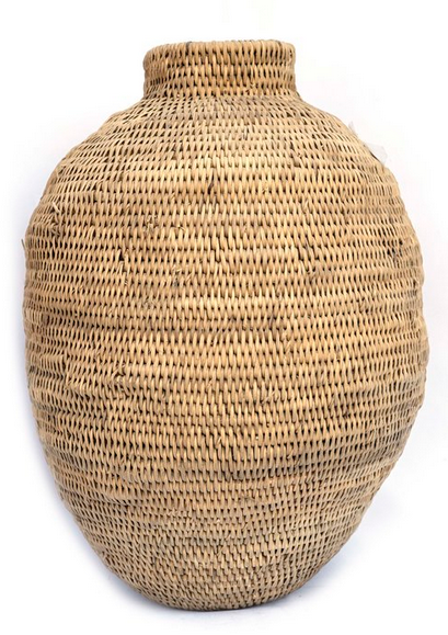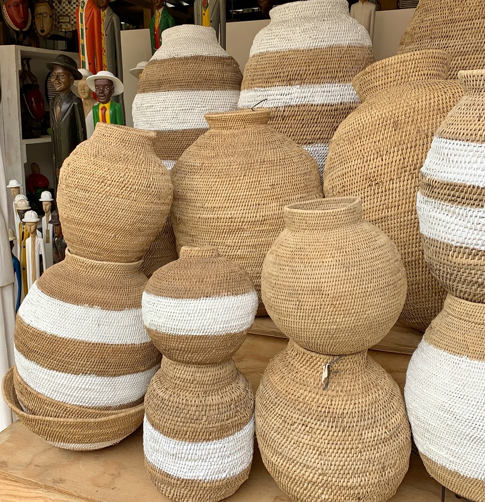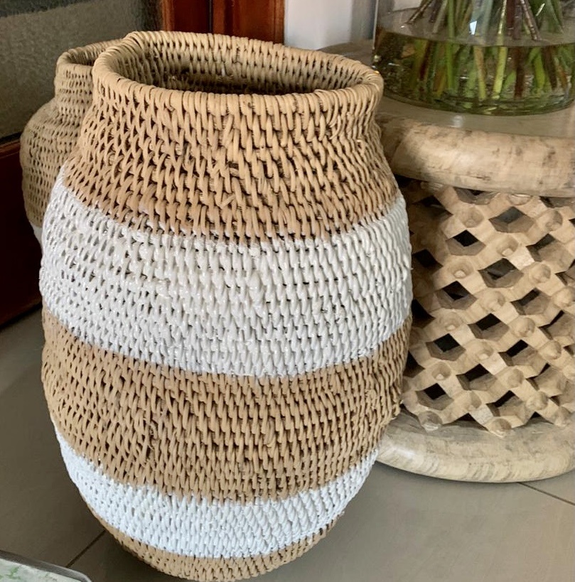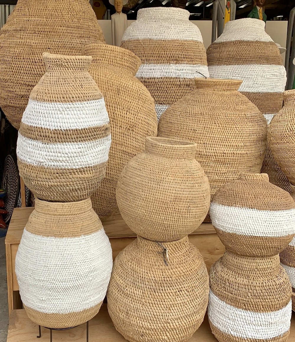 The Buhera Gourd baskets originate from the Buhera district in Zimbabwe. The baskets are handwoven with local natural grasses, and traditionally used by their crafters to store and carry grains. Available in various sizes with or without white or black stripes.
