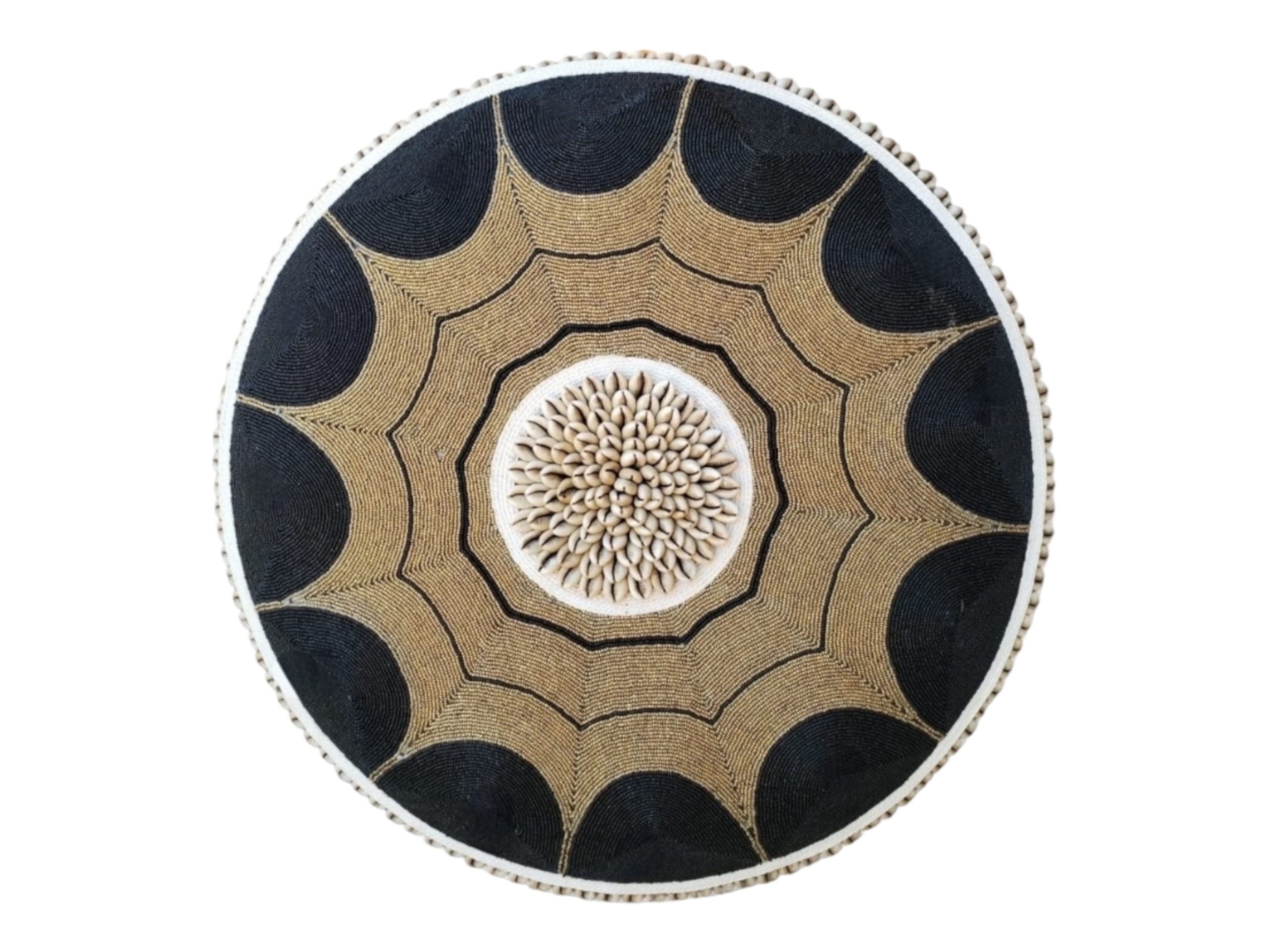 Authentic hand-beaded Tikar shield from Cameroon. Elevate your interior with a masterpiece of African craftsmanship. This exquisite, beaded shield is handcrafted by the skilled artisans of the Tikar tribe in Cameroon. Traditionally used as a defensive weapon and later as a symbol of status and wealth, this piece bridges the gap between historical significance and contemporary home decor. Hand-carved from a single piece of sacred Baobab wood. Adorned with thousands of meticulously hand-placed beads, featuring a dimensional, striking cluster of natural cowrie shells at the center and edges. A perfect focal point for a wall, mantle, or entry table, adding texture and cultural depth to modern spaces. Comes with a wall fitting for easy installation.