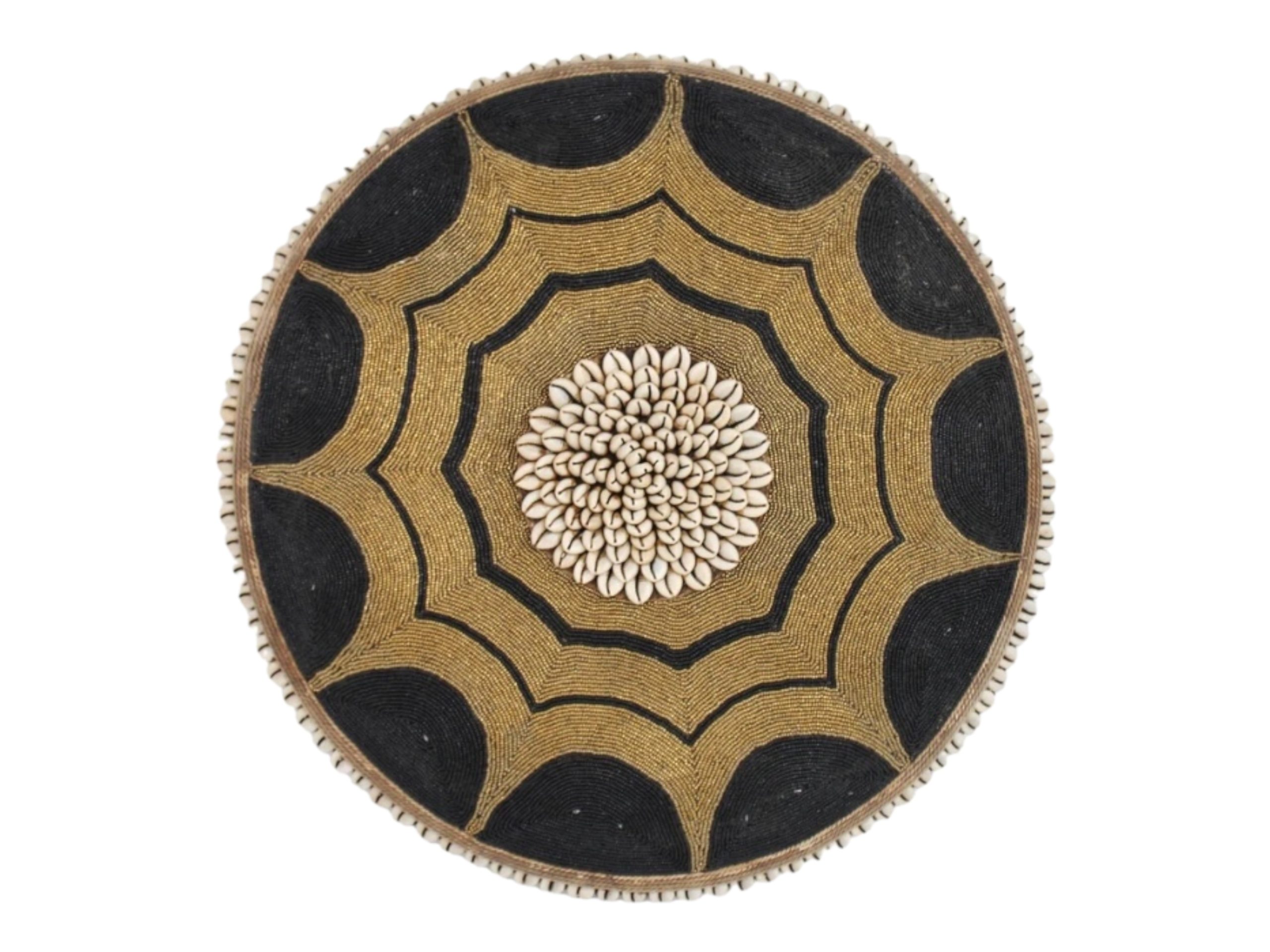 Authentic hand-beaded Tikar shield from Cameroon. Elevate your interior with a masterpiece of African craftsmanship. This exquisite, beaded shield is handcrafted by the skilled artisans of the Tikar tribe in Cameroon. Traditionally used as a defensive weapon and later as a symbol of status and wealth, this piece bridges the gap between historical significance and contemporary home decor. Hand-carved from a single piece of sacred Baobab wood. Adorned with thousands of meticulously hand-placed beads, featuring a dimensional, striking cluster of natural cowrie shells at the center and edges. A perfect focal point for a wall, mantle, or entry table, adding texture and cultural depth to modern spaces. Comes with a wall fitting for easy installation.