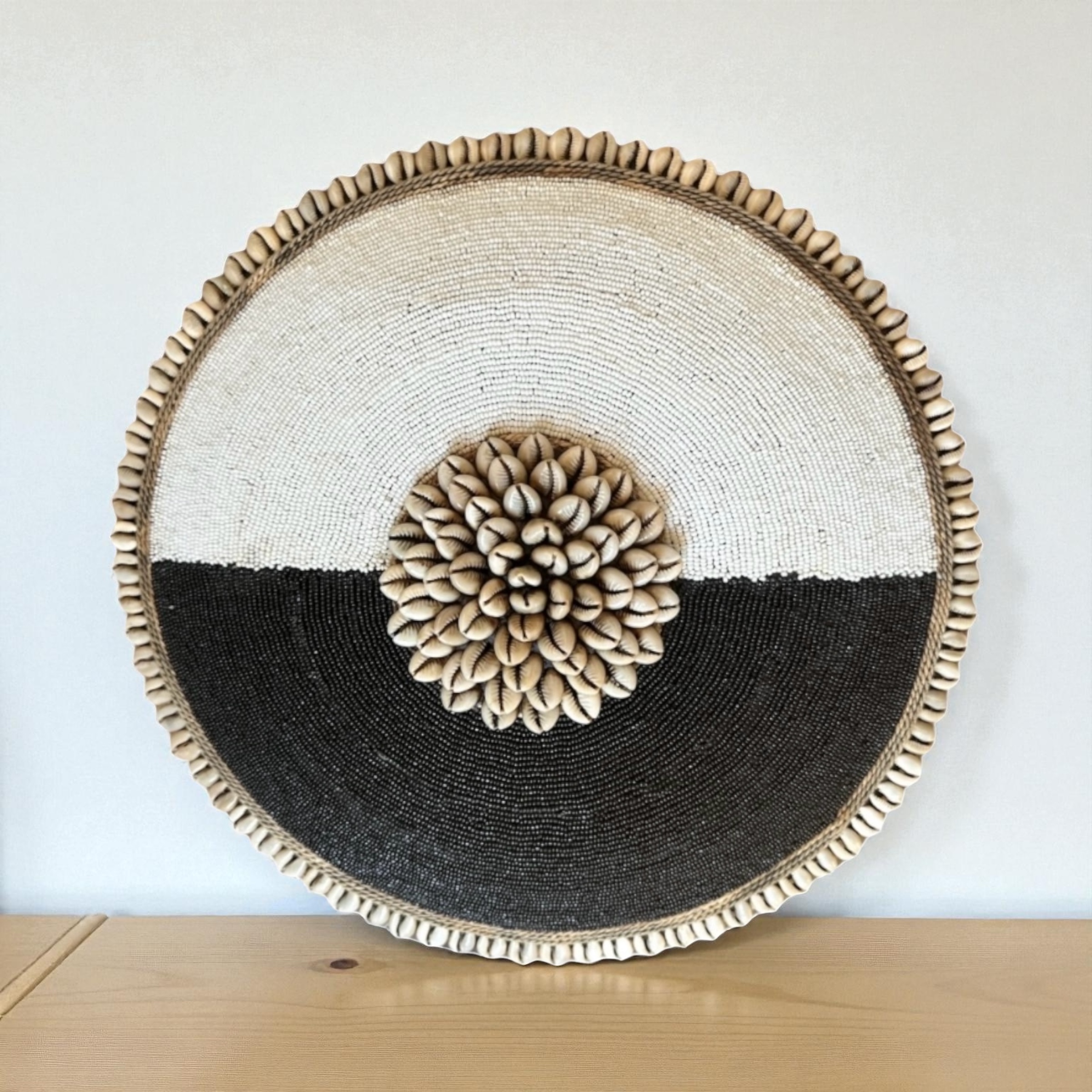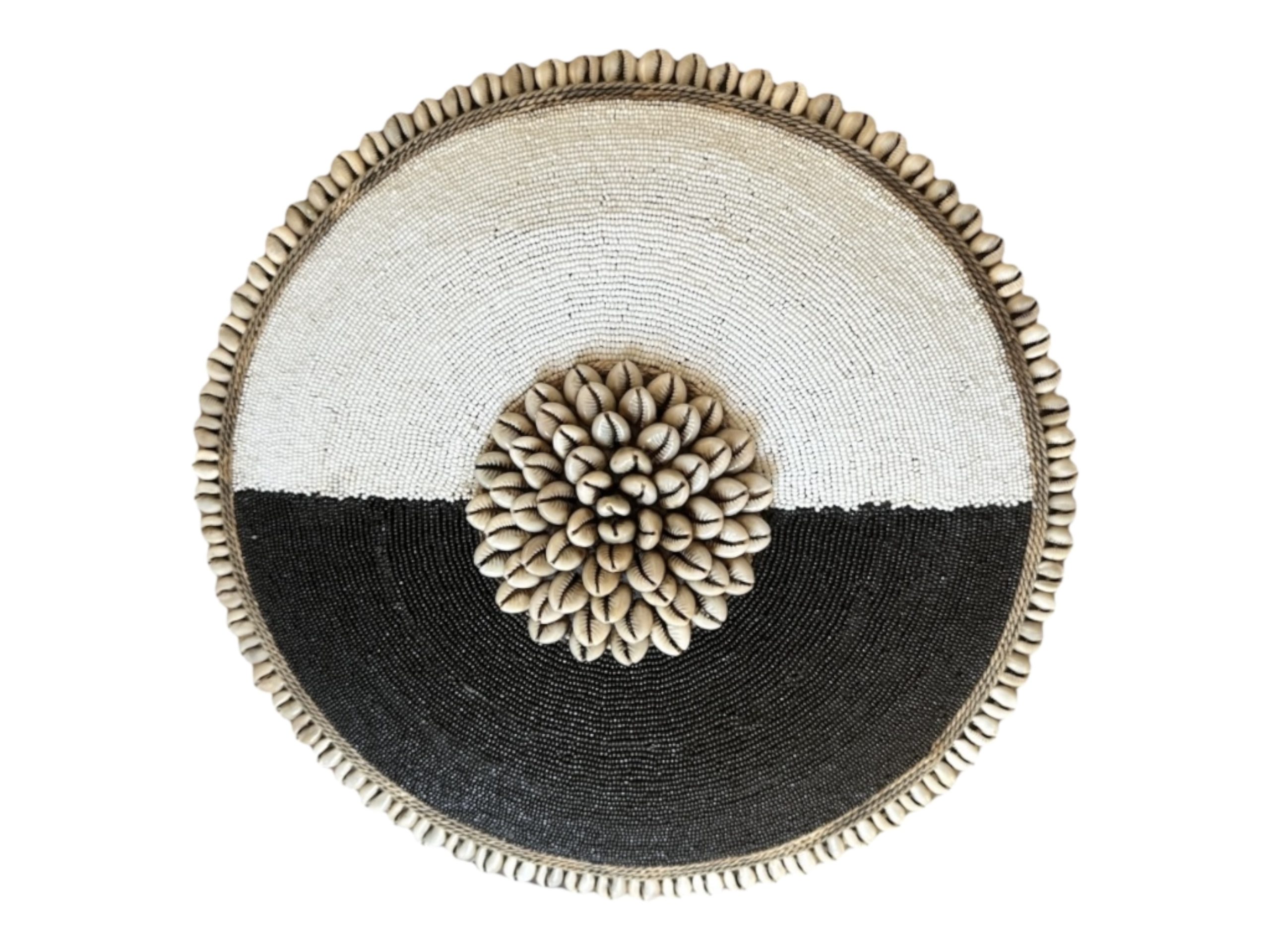 Be the first to review “Cameroon umbrella beaded shield black and white circles with cowrie shells and string 55cm”