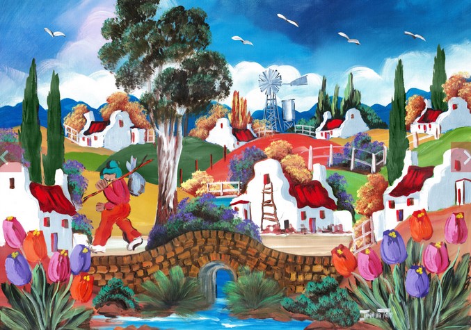 This beautifully colourful and fun image of a Cape Village is painted by local artist Jana du Toit.