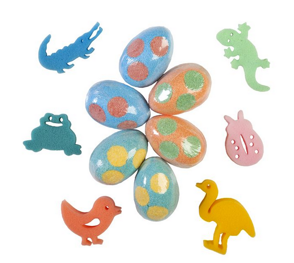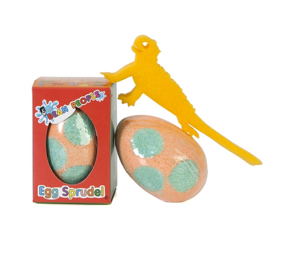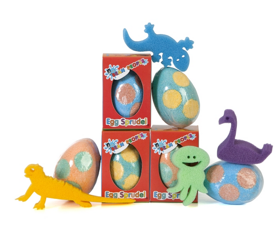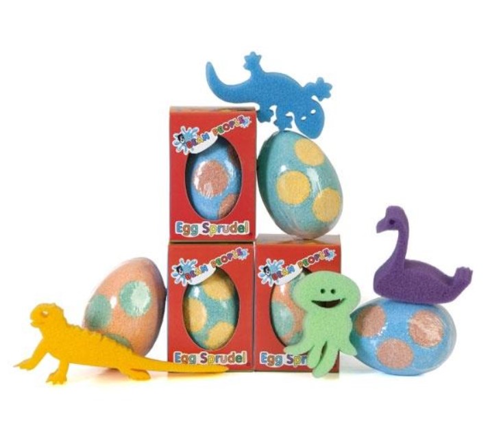 The Egg Sprudel comprises of an egg shape – with six differently coloured dots. It fizzes for about a minute, changing the colour of the bathwater, producing foam while simultaneously releasing an aromatic fragrance. The Sprudel also contains a chunky, egg-laying sponge character which magically appears after the fizz. The Egg Sprudels come individually packaged. It is a bath experience designed for children 3 years and above.