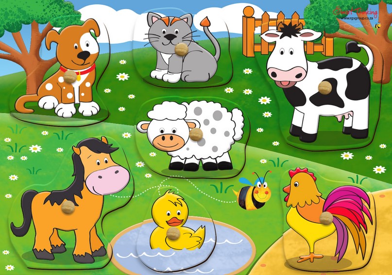 A beautifully illustrated wooden tray puzzle containing 7 pegged pieces.