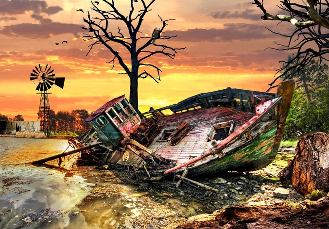 A picturesque backdrop and an old boat wreckage on the shore of Loskop.