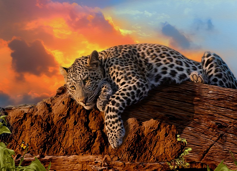 A majestic young leopard lying lazily over a tree stump at sunset.