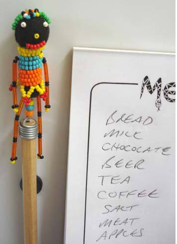 Same designs as the Zulu Doll Pencil just with a small magnet on. Perfect for the fridge so you always have a pencil handy for the shopping list. Unless otherwise requested you wil receive a mixture of designs.
